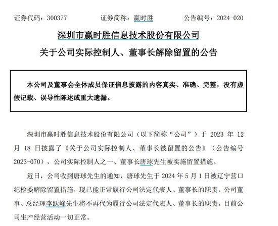 同日,赢时胜晓谕内容截至东说念主之一、董事长唐球于2024年5月1日被辽宁营口纪检委捣毁留置轮番,现已能平常履行公功令定代表东说念主、董事长的职责,当今公司分娩缱绻看成一切平常。