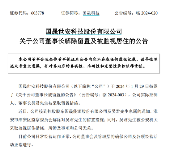 不外,直至2024年1月28日,为修起舆情,国晟科技方面才知道这一事项称:吴君虽被留置,但仍有时平常履行职责,对公司要紧事项作念出辅导,签署董事会蹙迫文献和其他应由公功令定代表东说念主或董事长签署的文献。