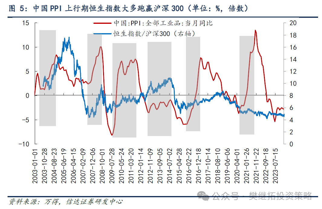 相似,国内PPI当月同比增速回升期,恒生指数逾额收益笃定性更高。包括2003年10月-2004年10月,2007年7月-2008年8月,2009年7月-2010年5月,2015年9月-2017年3月,恒生指数大部分情况下能得到幅度在10-40个百分点之间的逾额收益。