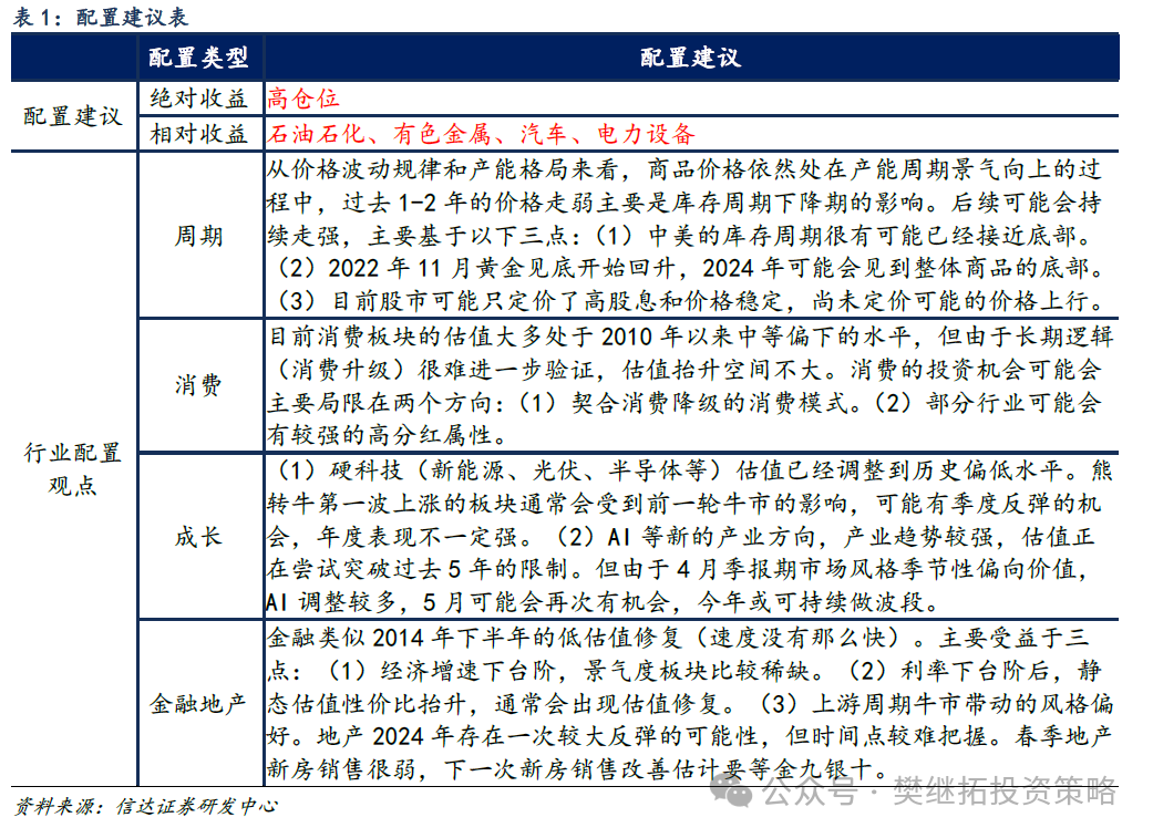 (4)短期A股策略不雅点:3月下旬以来的触动或已完结,5月可能持续上升。4月以来因为好意思联储降息推迟预期、季报期主题投资降温、经济数据受高基数影响发扬一般等身分影响,市集偏触动。这些影响到5月或将会渐渐完结,市集可能从头再次上行。咱们以为再次上行的中枢力量主要有三点:(1)好意思联储降息推迟背后是好意思国经济的再通胀,历史教会告诉咱们,再通胀的初期对权利时时是利多,因为许多经济关联类板块盈利时时会再次回升。众人经济库存周期有望共振上行,同期还有望粗疏国内的通缩预期,中国关联权利金钱或最受益。(2)国九条等关联战略握续发力,股市生态渐渐发生变化,股市融资限度减少,分成限度加多,供需结构握续改善。(3)2-3月市集上升的经由中,以私募为代表的完全收益类投资者仓位并不高,后续还有持续补仓的空间。
