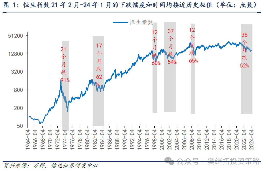 (1)恒生指数2021年2月-2024年1月的下落幅度和技能均接近历史极值。本轮恒生指数下落始于2021年2月,甩手2024年1月22日低点,本轮恒生指数熊市握续技能近3年,最大跌幅达到52%。跌幅并排1970年以来除1973-1974年(国际游资除掉、信贷收紧、石油危境下众人经济阑珊、好意思股熊市映射等身分共同作用下的熊市)之外的大级别熊市,同期亦然历史转折跌技能最长的熊市。