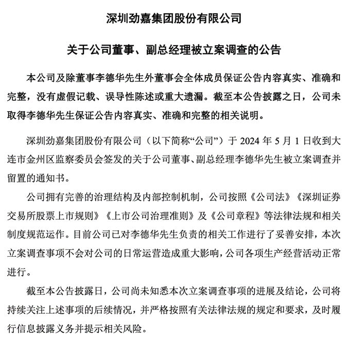 劲嘉股份(维权)(002191)5月5日晚间发布公告,公司于2024年5月1日收到大连市金州区监察委员会签发的对于公司董事、副总司理李德华先生被立案打听并留置的示知书。