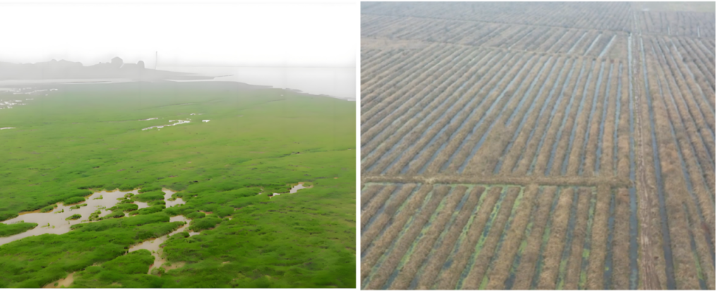 拼版相片:左图为南洞庭湖当然湿地景不雅(贵寓图片),右图为南洞庭湖挖沟抬垄近况。(看护组供图)